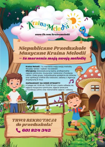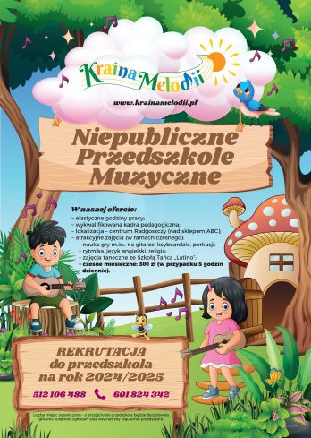 Drodzy Rodzice zastanawiąjący się nad zapisaniem dziecka do przedszkola… Serdecznie  zapraszamy Wasze pociechy do niezwykłego miejsca, w którym króluje MUZYKA, czyli do naszego Niepublicznego Przedszkola Muzycznego Kraina Melodii w Radgoszczy. Wyróżniamy się: atrakcyjnymi zajęciami muzycznymi i tanecznymi, elastycznymi godzinami pracy, wykwalifikowaną kadrą pedagogiczną, świetną lokalizacją w centrum Radgoszczy nad sklepem ABC.
