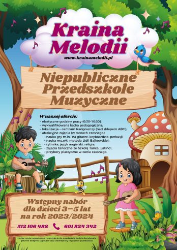 Drodzy Rodzice, zapraszamy Wasze pociechy do niezwykłego miejsca, czyli do naszego Niepublicznego Przedszkola Muzycznego Kraina Melodii w Radgoszczy. Wyróżniamy się: atrakcyjnymi zajęciami muzycznymi i tanecznymi, elastycznymi godzinami pracy, wykwalifikowaną kadrą pedagogiczną, świetną lokalizacją w centrum Radgoszczy nad sklepem ABC. Szczegóły na plakacie, zapraszamy też do kontaktu: 512 106 488 lub 601 824 342 oraz dyrekcja@krainamelodii.pl.