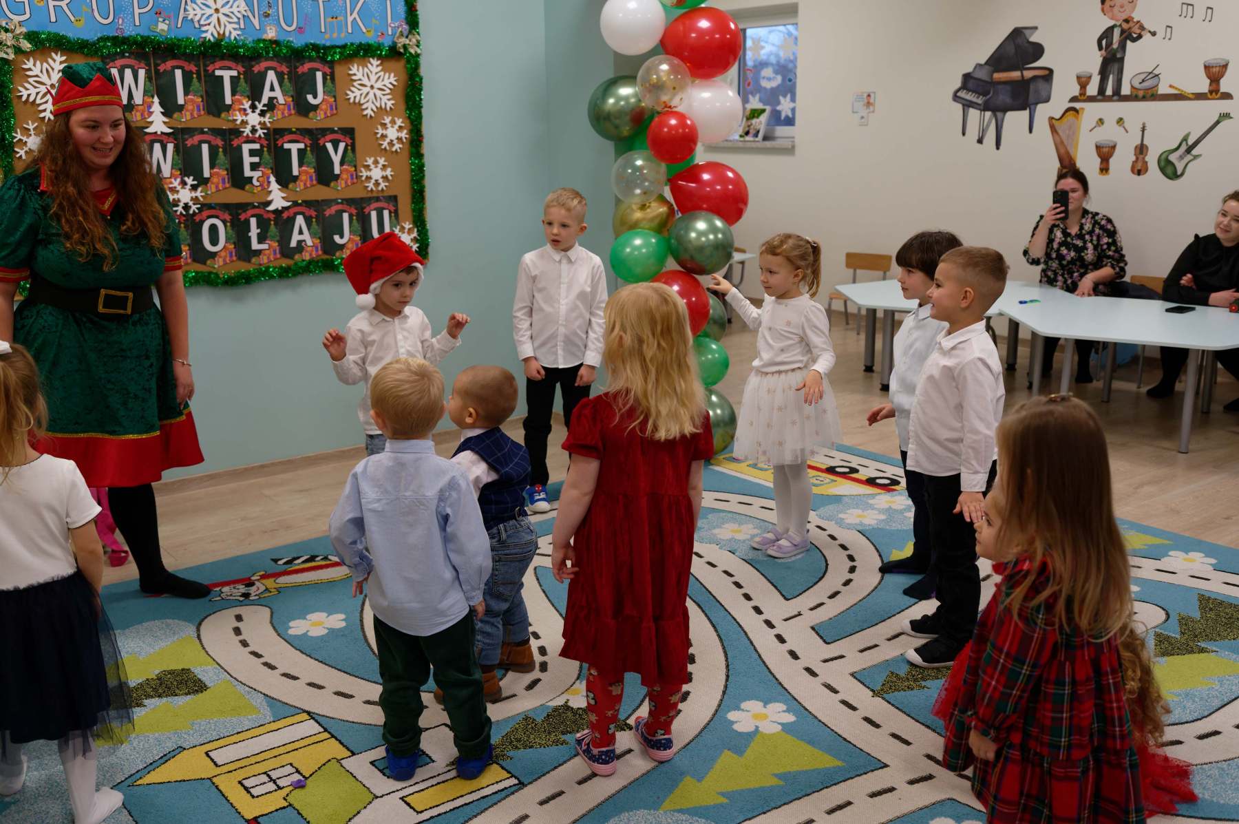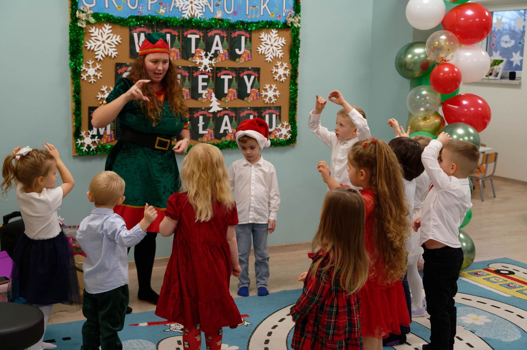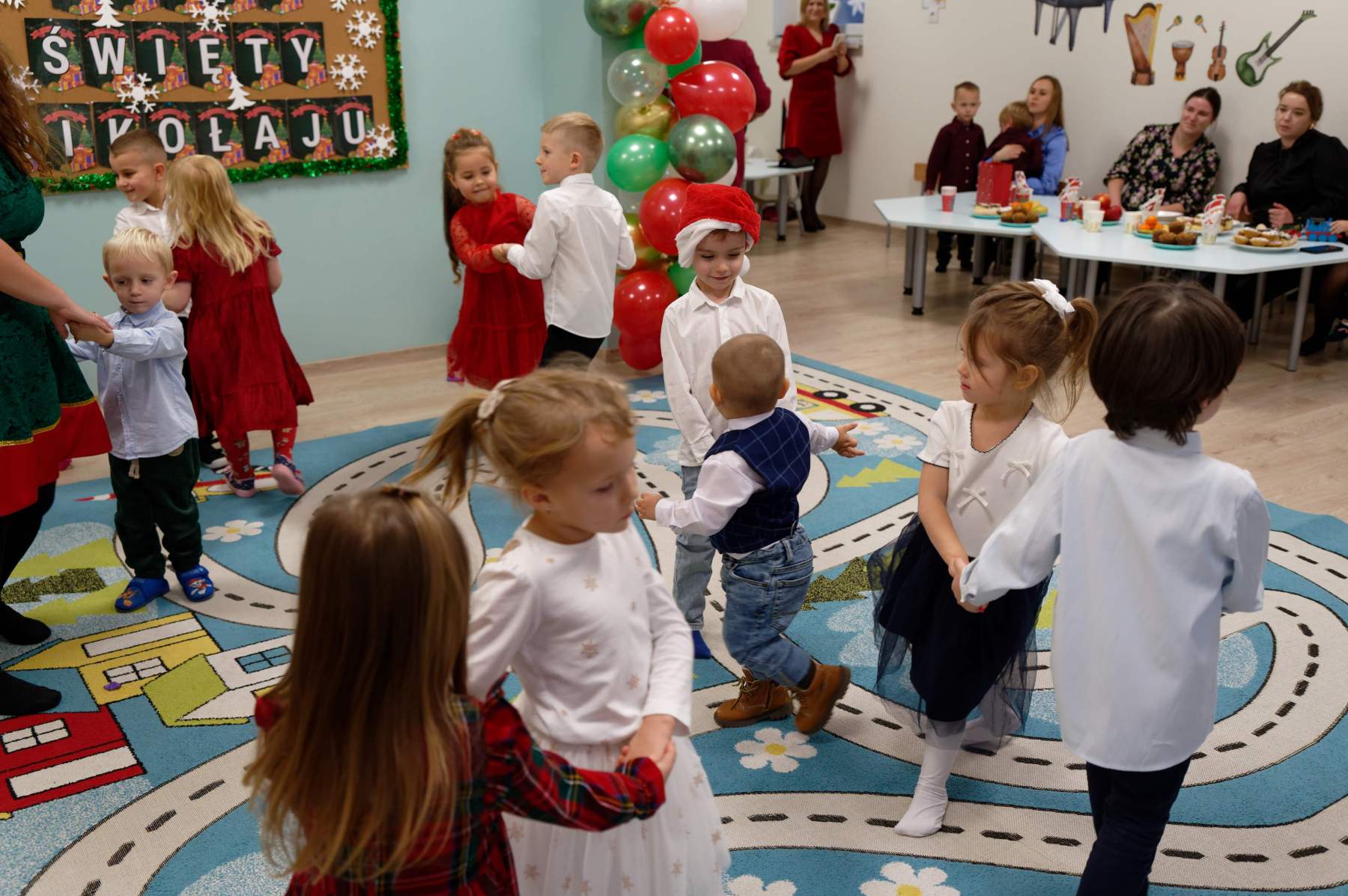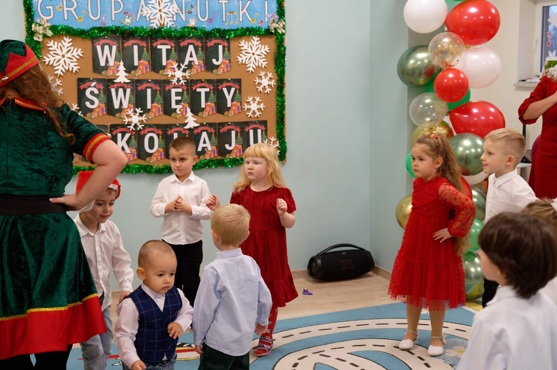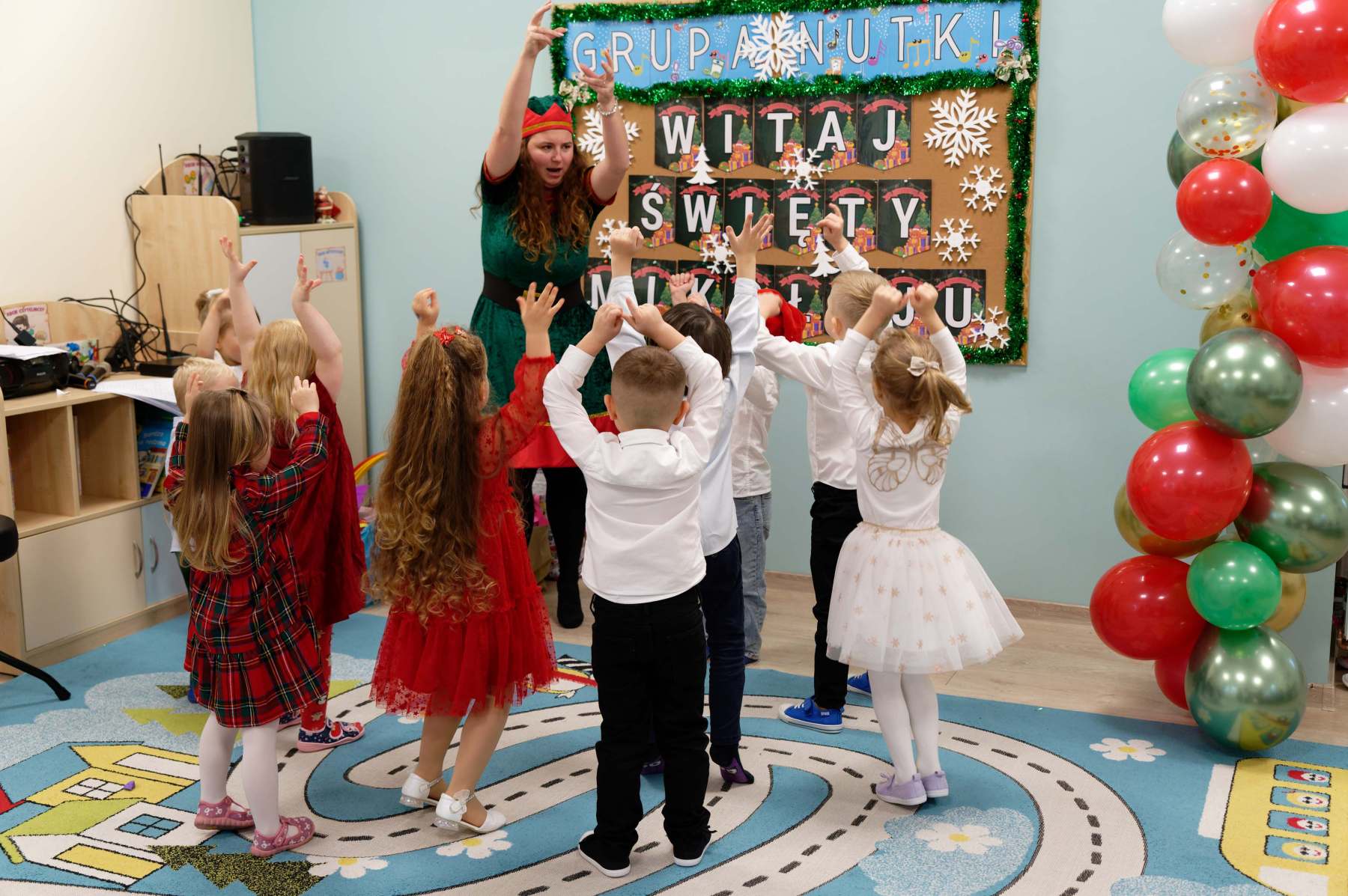 To był wyjątkowy dzień dla Nutek – pełen radości i świątecznej atmosfery. Do przedszkola zawitał bowiem upragniony gość – św. Mikołaj. Wizycie towarzyszyły także animacje. Dzieci brały udział w zabawach tanecznych, wspólnych pląsach i aktywnościach ruchowych, które sprawiły, że na twarzach wszystkich wychowanków pojawiły się szerokie uśmiechy.