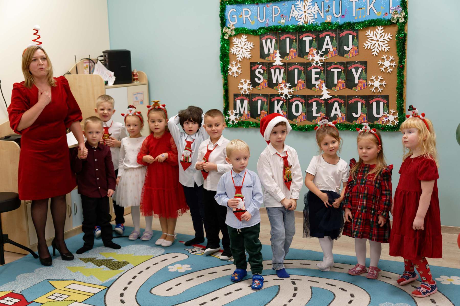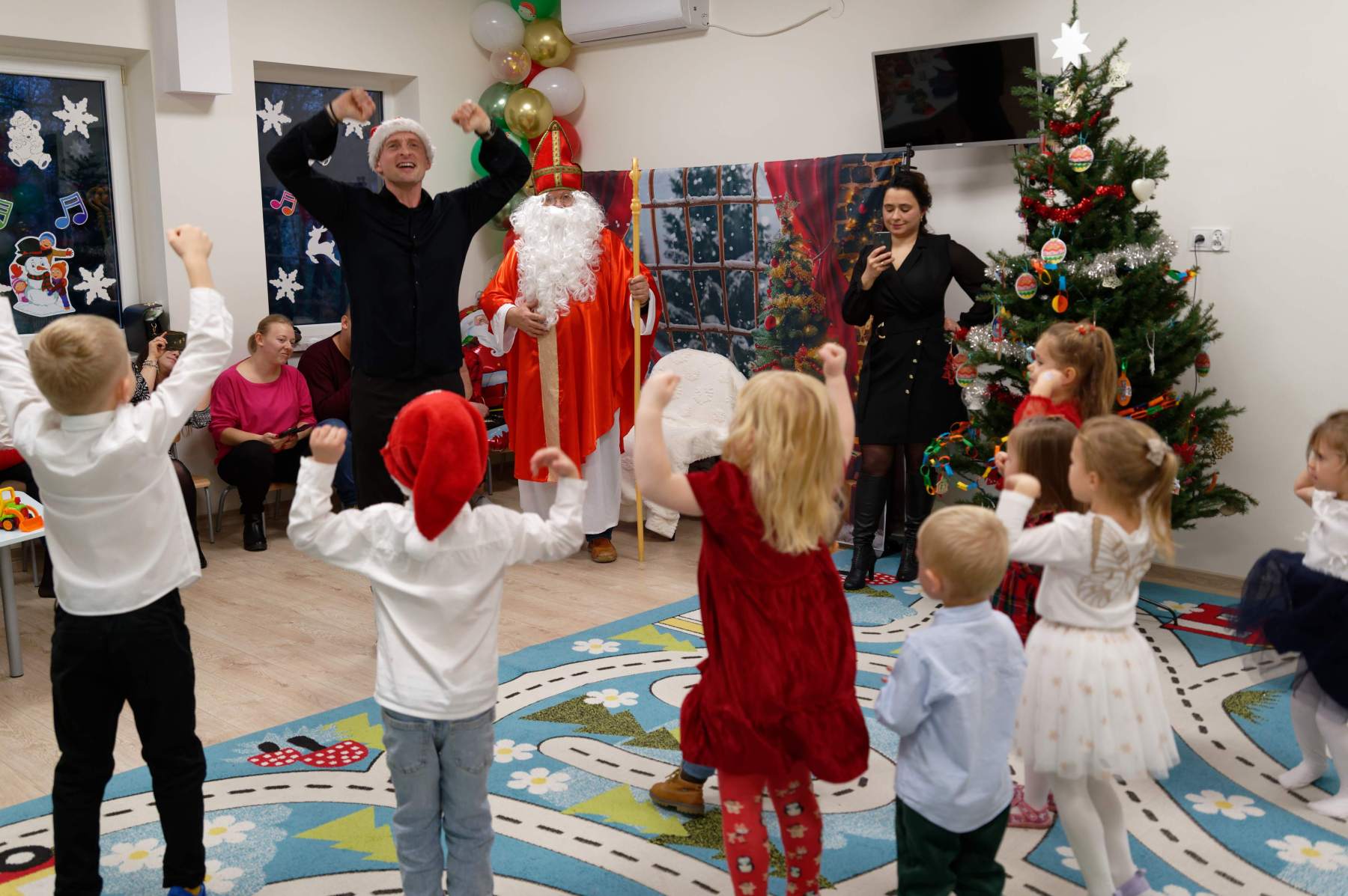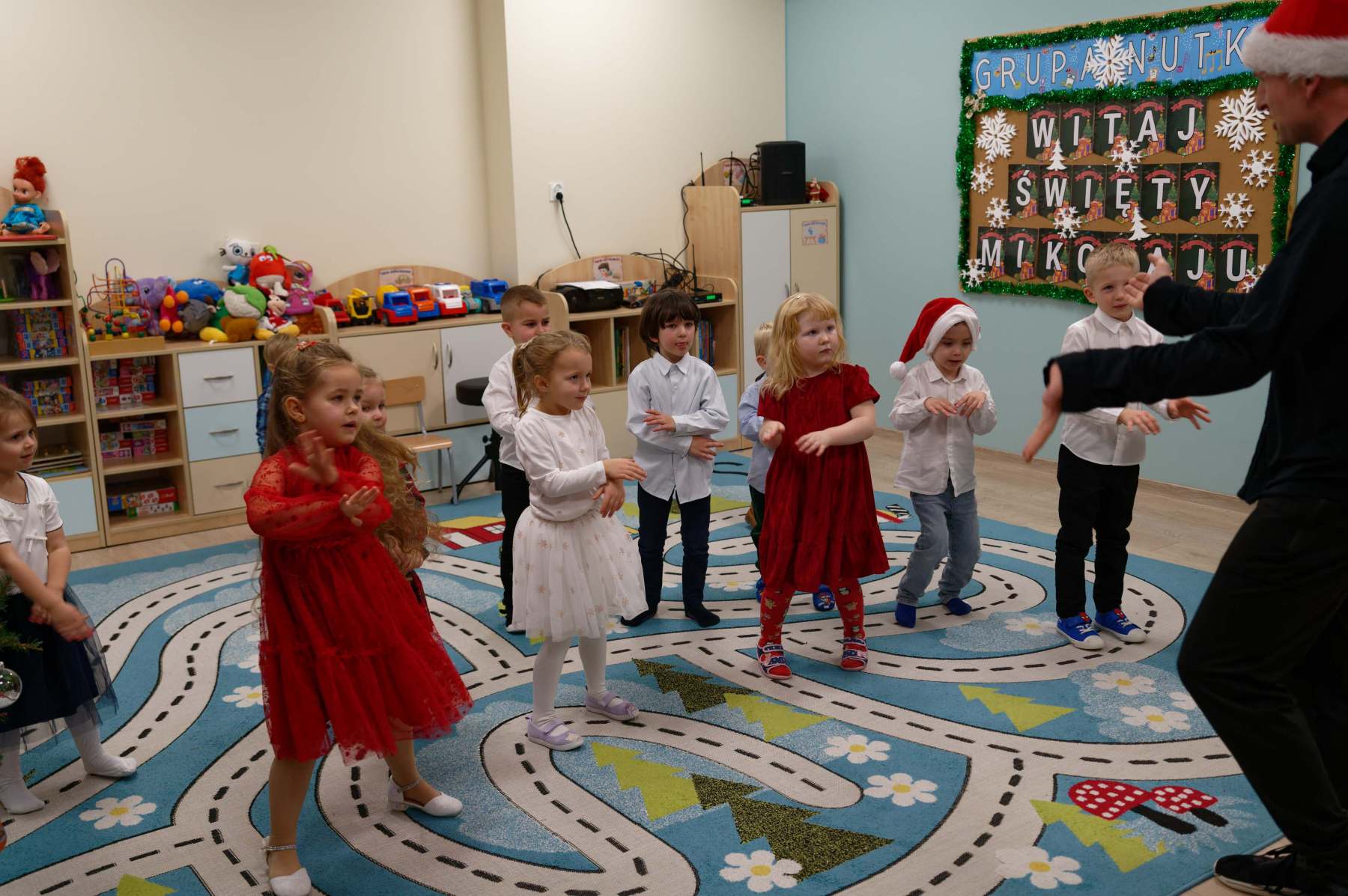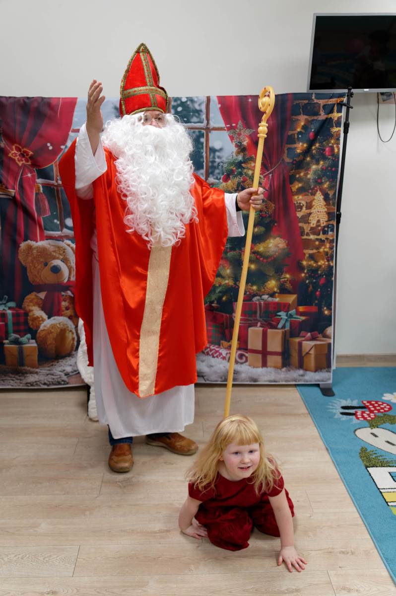 To był wyjątkowy dzień dla Nutek – pełen radości i świątecznej atmosfery. Do przedszkola zawitał bowiem upragniony gość – św. Mikołaj. Wizycie towarzyszyły także animacje. Dzieci brały udział w zabawach tanecznych, wspólnych pląsach i aktywnościach ruchowych, które sprawiły, że na twarzach wszystkich wychowanków pojawiły się szerokie uśmiechy.
