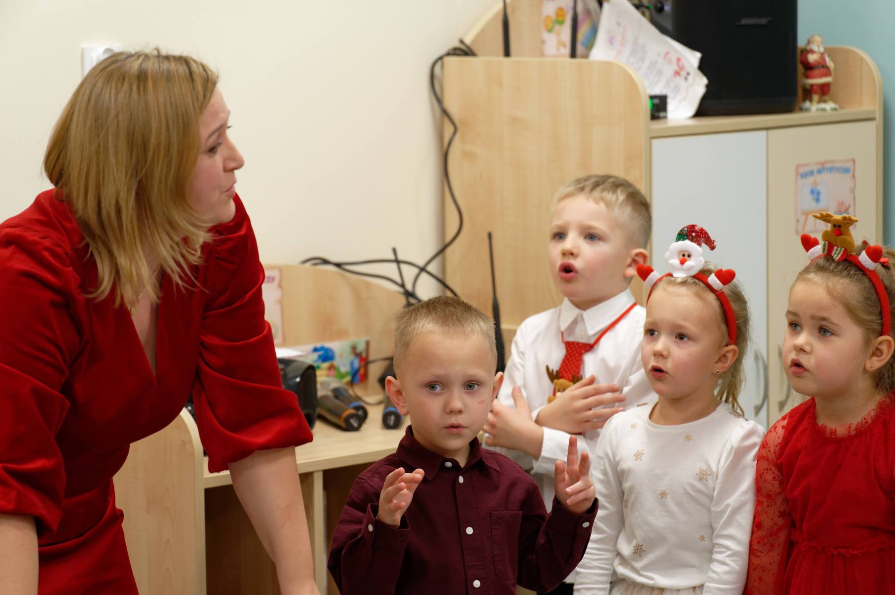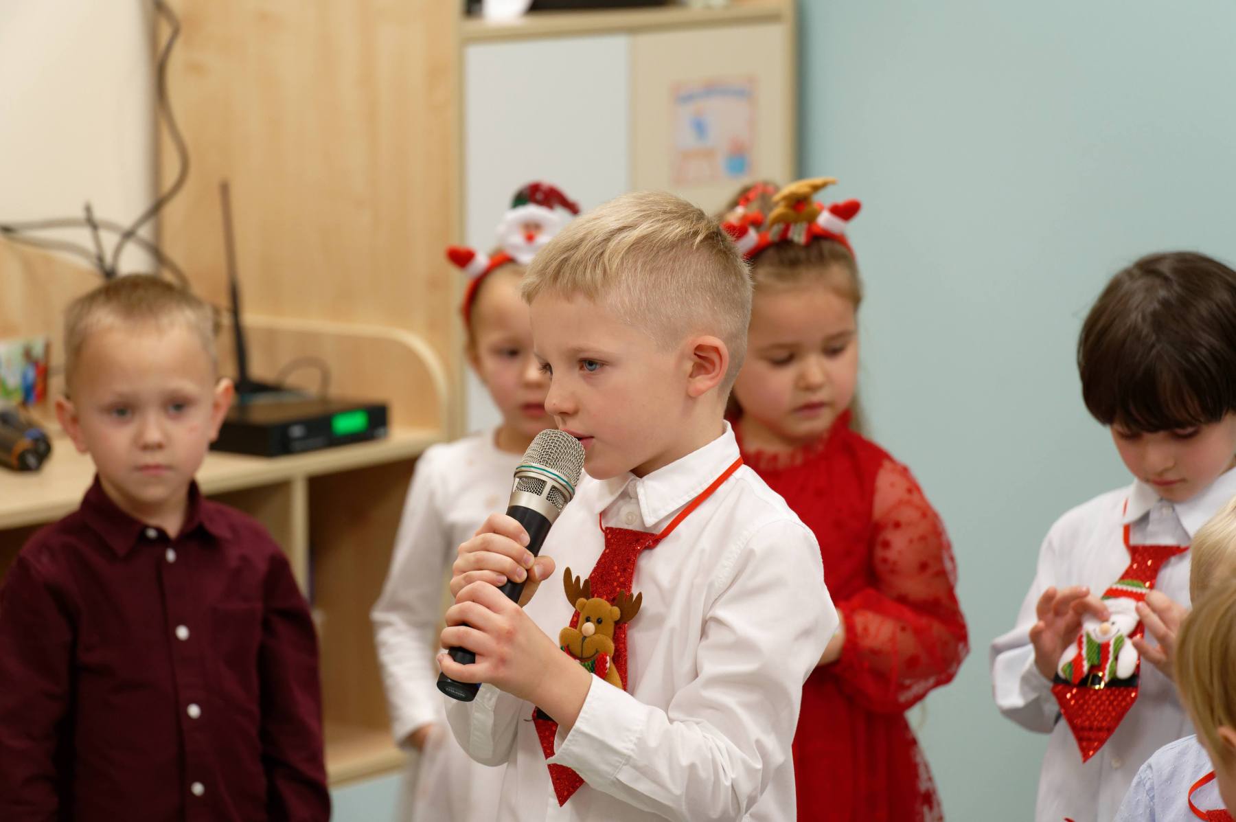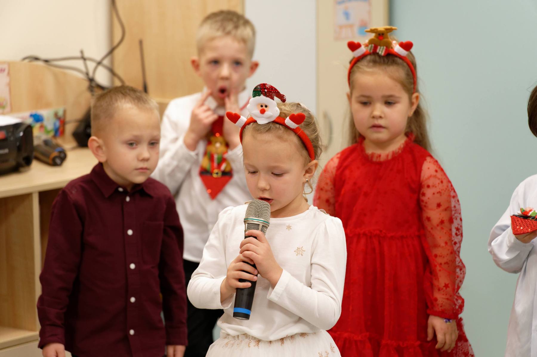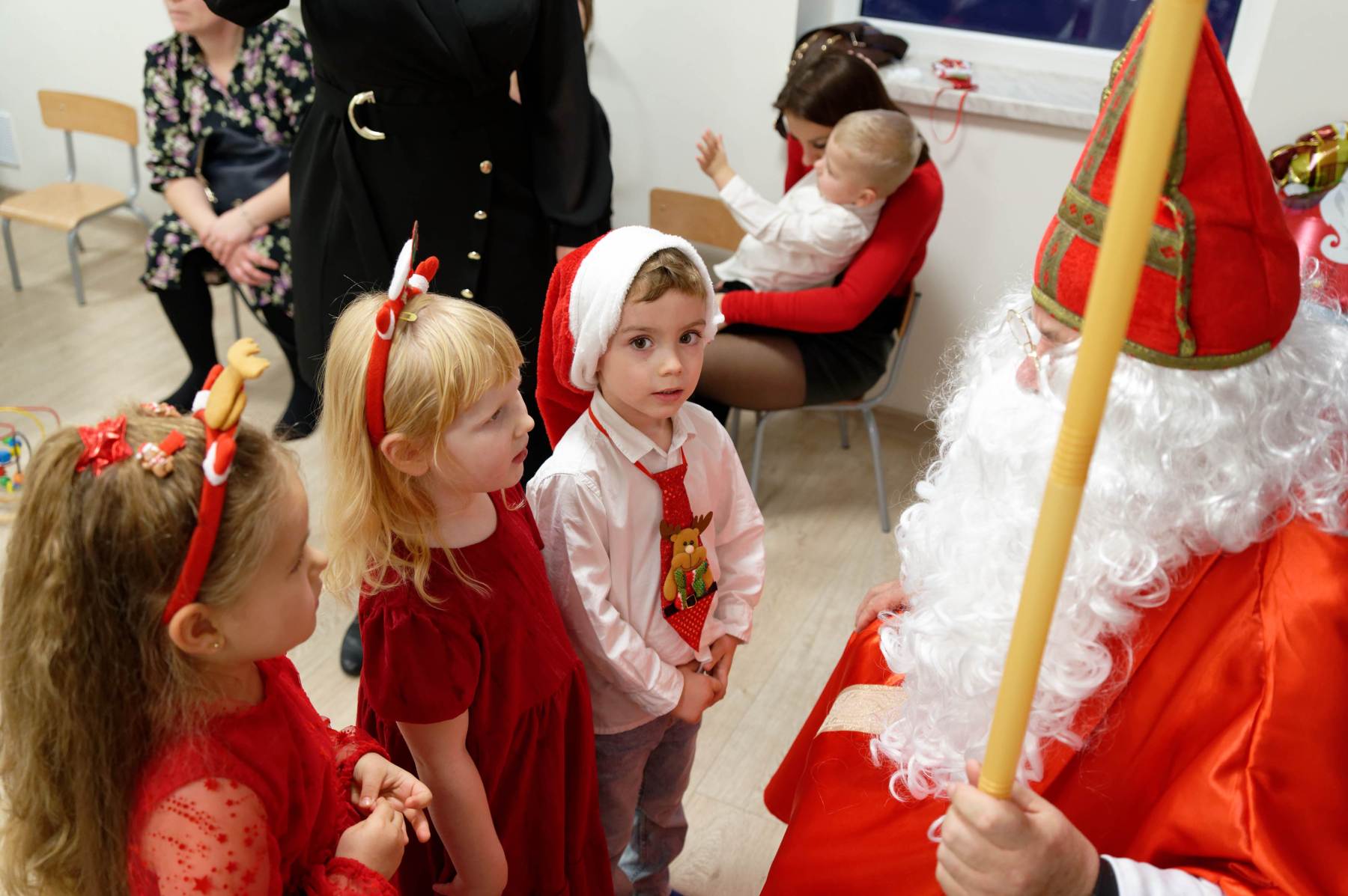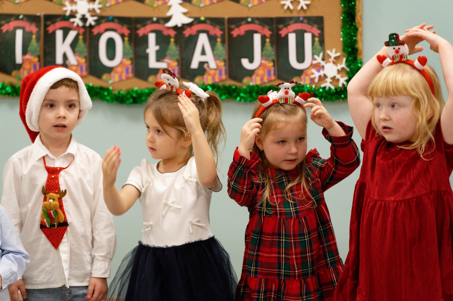 To był wyjątkowy dzień dla Nutek – pełen radości i świątecznej atmosfery. Do przedszkola zawitał bowiem upragniony gość – św. Mikołaj. Wizycie towarzyszyły także animacje. Dzieci brały udział w zabawach tanecznych, wspólnych pląsach i aktywnościach ruchowych, które sprawiły, że na twarzach wszystkich wychowanków pojawiły się szerokie uśmiechy.